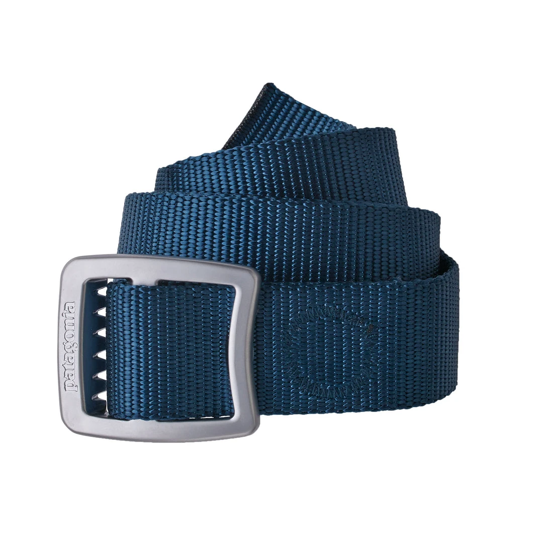 Burly, recycled nylon-webbing belt with an aluminum buckle can be used in a pinch as a lash strap or bottle opener.